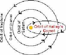 Halleys sonnennächste Entfernung beträgt 0,587 AE, was etwas mehr als die Hälfte des Abstandes von der Sonne zur Erde ist. Seine weiteste Entfernung sind 17,94 AE, was bedeutet, daß er knapp bis zur Uranus-Bahn fliegt, von wo aus er wieder zur Sonne zurückstürzt.