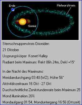 Der jährlich auftretende und von Partikeln des Kometen Halley erzeugte Meteoriten -Schwarm nennt sich Orioniden-Schwarm, denn er scheint aus dem Sternbild des Orion zu kommen