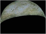 Dies ist die erste Aufnahme des Jupitermondes Europa aus einer Entfernung von 241.000 Kilometern zur Oberfläche, übermittelt von der Sonde Voyager Two. Die Linien und Risse sind Reflexionsmuster, die man für das Ergebnis von zugrundeliegenden Zerklüftungen der Kruste hält. Durch neueste Datenübermittlung der Galileo Sonde konnte die Oberfläche von Europa genauestens untersucht werden.