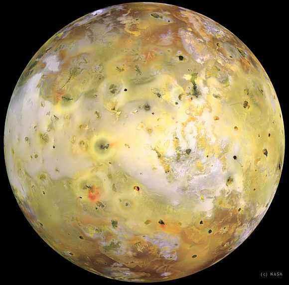 Dieses Bild wurde beim Vorbeiflug an Jupiter und Io von Voyager 1 am 4. März 1979 aufgenommen. Die braunen und orangen sind wahrscheinlich von Schwefel, oder von einem schwefelhaltigen Gemisch bedeckt. Die helleren Gebiete sind wahrscheinlich mit Schwefeldioxyd (SO2) bedeckt. Die pockennarbenähnlichen Gebilde sind Vulkane von bis zu 200 km Durchmesser. In der Nähe beider Pole gibt es gebirgige Landschaften mit Erhebungen von bis zu 8 Kilometern über die Umgebung.