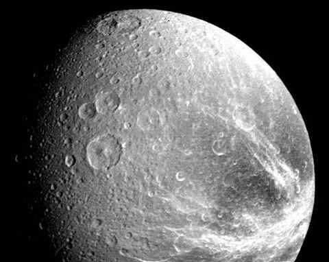 Viele Einschlagskrater sind auf diesem Bild der Raumsonde Voyager 1 auf dem Saturnmond Dione zu sehen. Voyager 1 hat die Aufnahme in einer Entfernung von 240'000 km am 12. November 1980 gemacht. Die hellen Strahlen sind möglicherweise durch bei den Einschlägen aus den Kratern geschleudertem Material entstanden. Andere helle längliche Objekte sind aber auch Täler und Bergflanken. Ebenfalls sind unregelmässige Täler sichtbar, welche Zeugen alter Verwerfungen sind. Die abgebildete Seite ist diejenige, die dem Saturn zugewandt ist. Aufnahme JPL/NASA.