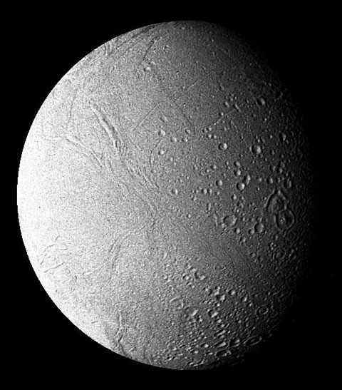 Diese Aufnahme von Voyager 2 zeigt auf dem Saturn-Mond Tethys Oberflächendetails ab 5 Kilometern Grösse. Dies gelang am 26. August 1981 aus einer Entfernung von rund 280'000 km. Auffällig ist der Typenwechsel des Geländes zwischen stark verkraterten Regionen (oben rechts) und weniger stark verkraterten Gebieten (unten rechts). Dies deutet auf eine geologische Aktivtät des Mondes zu Beginn seiner Geschichte hin, die die alten Gebiete teilweise aufgeschüttet hat. Vom grossen Krater (oben rechts) gehen Gräben aus, die fast den gesamten Globus umlaufen und einige Kilometer tief sind. Dies deutet auf eine eisige, steife Kruste hin. Diese Gräben könnten durch Ausdehnung des früher heissen inneren Kerns herrühren, so dass die Kruste aufgebrochen ist. JPL/NASA.