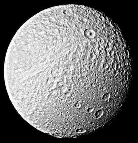 Diese Aufnahme von Voyager 2 zeigt auf dem Saturn-Mond Tethys Oberflächendetails ab 5 Kilometern Grösse. Dies gelang am 26. August 1981 aus einer Entfernung von rund 280'000 km. Auffällig ist der Typenwechsel des Geländes zwischen stark verkraterten Regionen (oben rechts) und weniger stark verkraterten Gebieten (unten rechts). Dies deutet auf eine geologische Aktivtät des Mondes zu Beginn seiner Geschichte hin, die die alten Gebiete teilweise aufgeschüttet hat. Vom grossen Krater (oben rechts) gehen Gräben aus, die fast den gesamten Globus umlaufen und einige Kilometer tief sind. Dies deutet auf eine eisige, steife Kruste hin. Diese Gräben könnten durch Ausdehnung des früher heissen inneren Kerns herrühren, so dass die Kruste aufgebrochen ist. JPL/NASA.