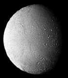 Diese Aufnahme von Voyager 2 zeigt auf dem Saturn-Mond Tethys Oberflächendetails ab 5 Kilometern Grösse. Dies gelang am 26. August 1981 aus einer Entfernung von rund 280'000 km. Auffällig ist der Typenwechsel des Geländes zwischen stark verkraterten Regionen (oben rechts) und weniger stark verkraterten Gebieten (unten rechts). Dies deutet auf eine geologische Aktivtät des Mondes zu Beginn seiner Geschichte hin, die die alten Gebiete teilweise aufgeschüttet hat. Vom grossen Krater (oben rechts) gehen Gräben aus, die fast den gesamten Globus umlaufen und einige Kilometer tief sind. Dies deutet auf eine eisige, steife Kruste hin. Diese Gräben könnten durch Ausdehnung des früher heissen inneren Kerns herrühren, so dass die Kruste aufgebrochen ist. JPL/NASA. |