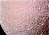 Voyager 1 fotografierte den Saturn-Mond Rhea bei der nächsten Annäherung am 12. November 1980 aus einer Distanz von 128'000 km. Der abgebildete Ausschnitt zeigt die am stärksten von Einschlagskratern übersähte Region Rheas. Die deutet darauf hin, dass wir die Oberfläche sehen, wie sie nach der Entstehung des Mondes vor 4.5 Milliarden Jahre offengelegt wurde. Es sind Oberflächendetails bis etwa 2.5 km Grösse erkennbar. JPL/NASA. |