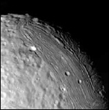 Die Monde sind Welten aus Eis. Die grössten Monde sind gerade mal etwas mehr als 1000 km gross. Miranda, der innerste schon vor dem Voyager-Vorbeiflug bekannte Mond, scheint irgendwann einmal zerbrochen und neu zusammengesetzt worden zu sein. Eine bizarre, nur 400 km grosse Welt im Dämmerlicht des äusseren Sonnensystems. |